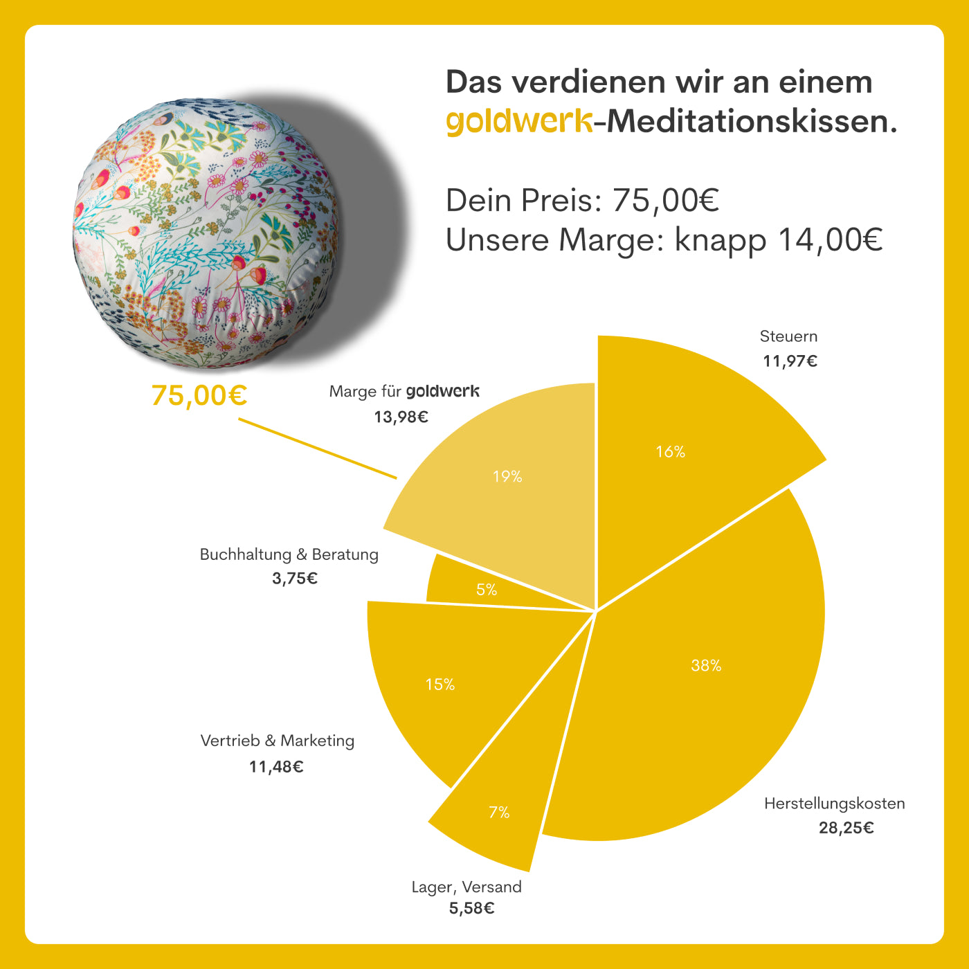 Dass unser Erfolg sich auf viele Schultern verteilt. Dass es uns nicht darum geht, die höchstmöglichen Margen für GOLDWERK zu erzielen, sondern die bestmögliche Wirkung für die ganze Welt. Mit jedem verkauften GOLDWERK Produkt gehen wir Schritt für Schritt, Bolster für Bolster in ein besseres Morgen. Danke, dass du das möglich machst!